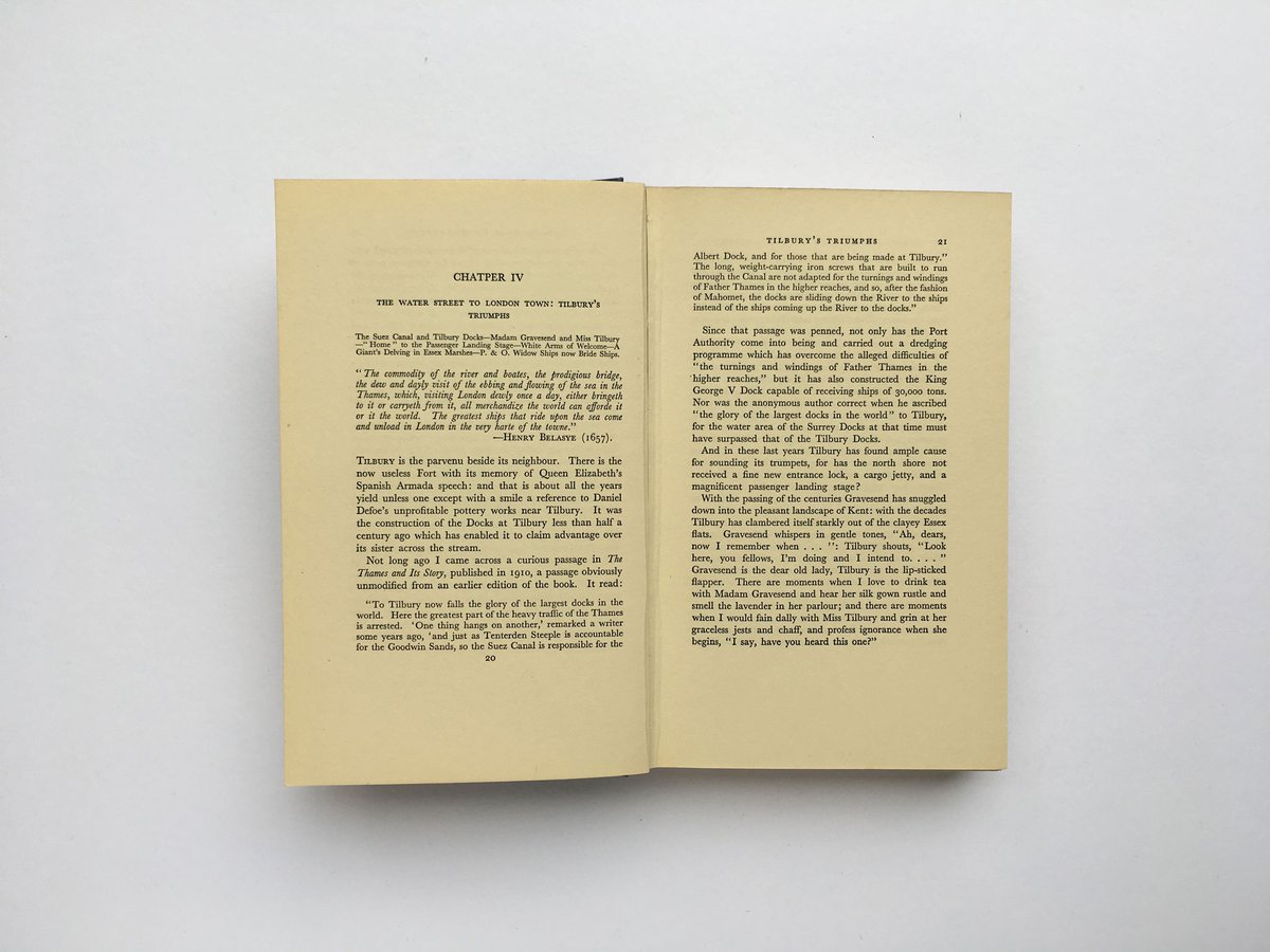 Alongside several others, this was one of the books ‘Ventures and Adventures in Topography’, Nick Papdimitriou and John Roger’s series on Resonance FM, which follows historic guidebooks to London’s periphery, introduced me to. I have to confess to not having found the time to read it yet, but – in good company of many others – it is on my list. Linney became the first editor of the Port of London Authority Monthly Magazine, and published his first book, ‘Peepshow of the Port of London’ on the subject. The ‘Lure and Lore’ is the follow-up publication and looks at the London River from the sea up to Kew – the section of the river neglected by most authors: “(…), but I have noticed that most writers provide a detailed story, swelled with literary and historical allusions, of the River from its rise to Westminster. At that stage many consider that the main work is done, and they dismiss the remaining fifty-odd miles in a chapter or couple of chapters”. He devotes thirty chapters spanning over 230 pages, interspersed with maps and photographs, many of them his own, to the subject. As many of his contemporaries, and in contrast to most people who write about the river today, he starts his book not in London, but in the outer estuary – quoting in the very first chapter Hillaire Belloc, who’s ‘The River of London’ (LINK) (which precedes Linney’s book by 20 years) takes the same approach, arguing that the relationship between London and its River can only be understood if approached from the sea: “I think that to know the River of London the journey must be made from the sea upwards, in something not larger than a barge, in a motor boat or in a fishing vessel, or little half-rater, and taken upon the tide with an easterly wind, as all the men of the past took it, making the great port upstream under the weather they had chosen”.